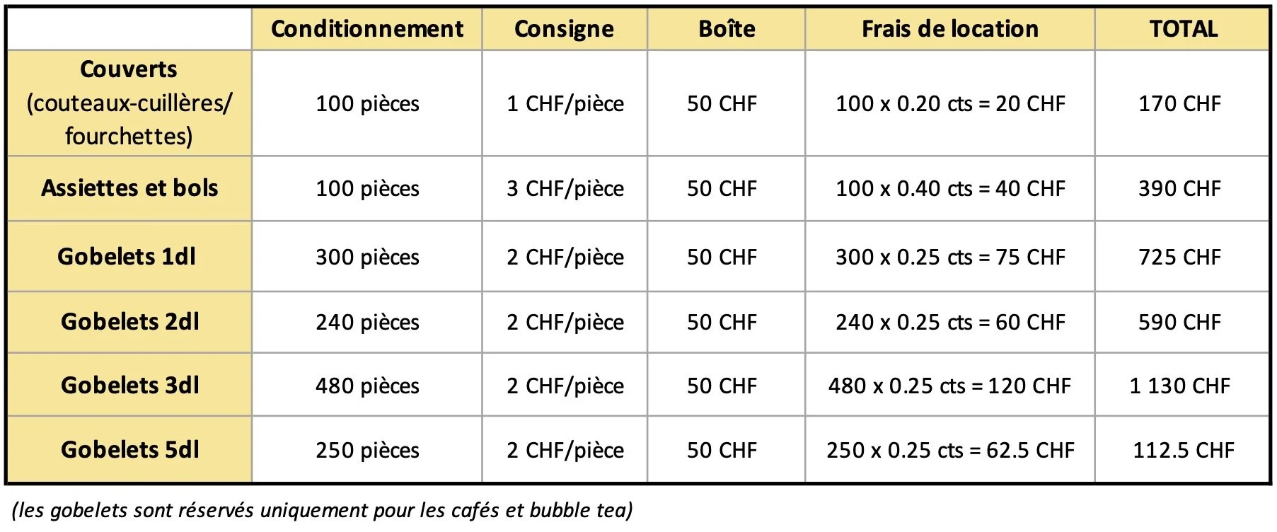 Chaque Food Truck / stand demande une consigne à son client tel qu’indiqué ci-dessous en lui donnant un jeton pour chaque élément de vaisselle utilisé.